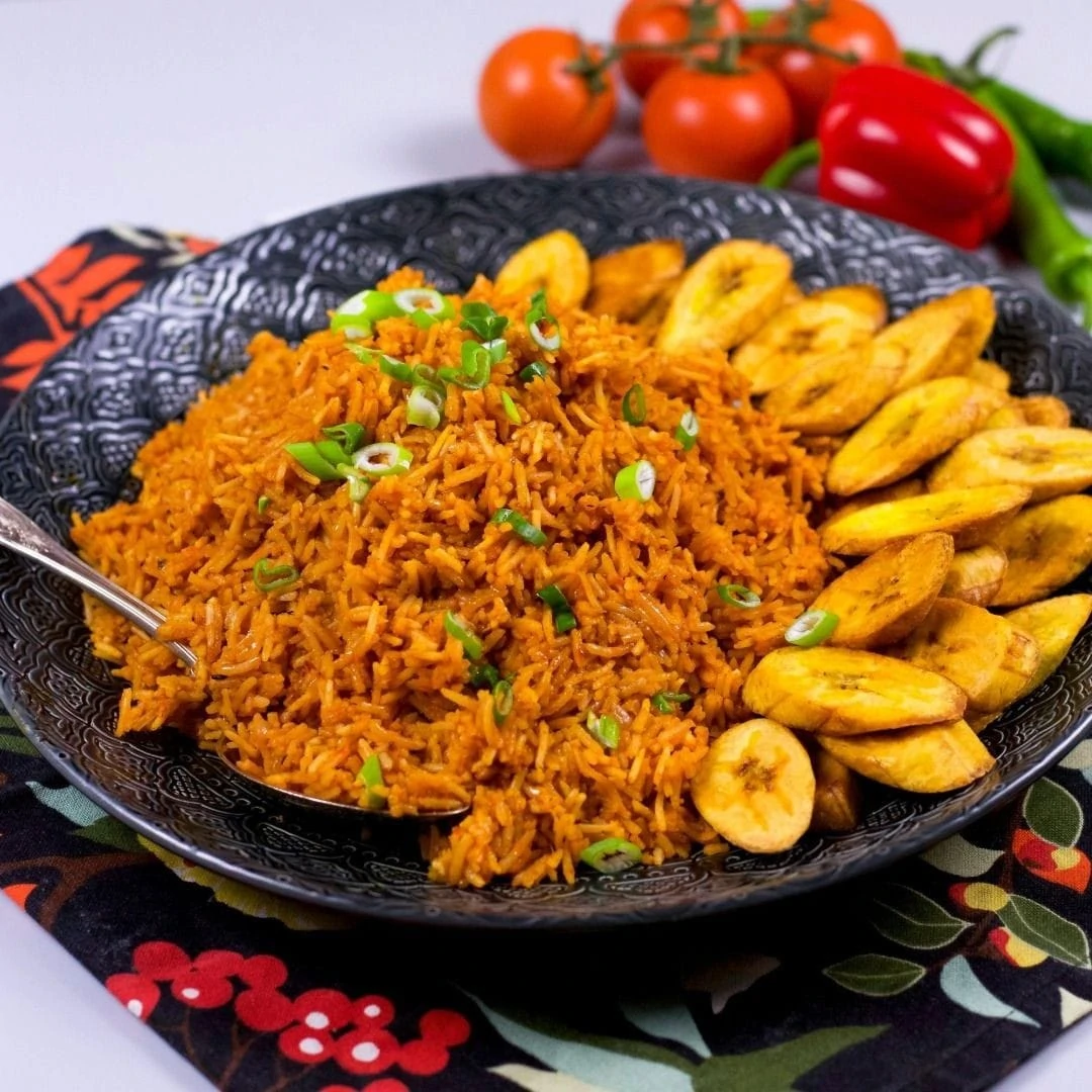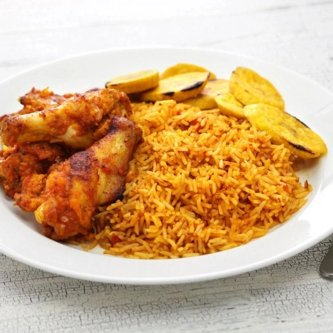 Basmati Jollof Rice 5 Peace of well seasoned Chicken wings and fried Plantain.